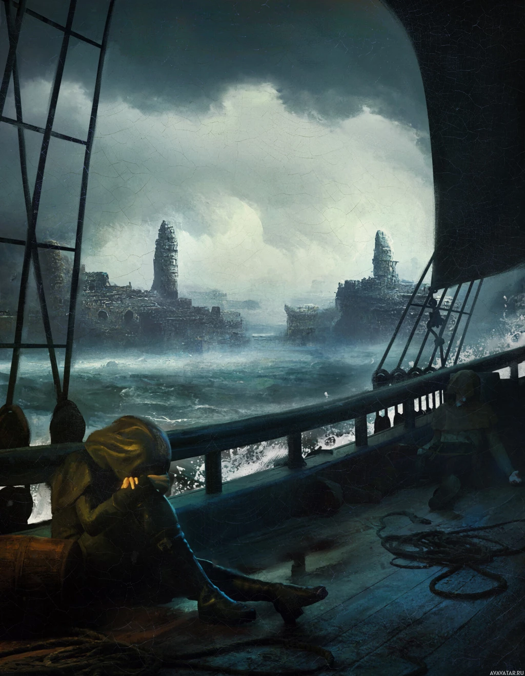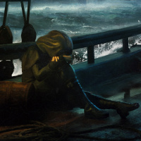 the solitary figure at the helm and the dark, ominous weather conditions outside. The style of the artwork has