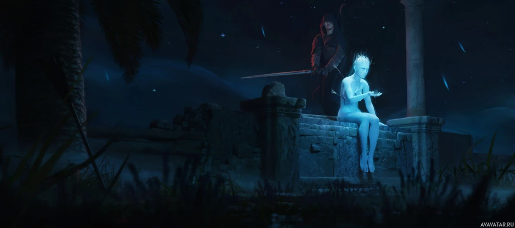 Изображение похоже на скриншот из видеоигры, на котором изображена фантастическая сцена с призрачной фигурой. Персонаж, похоже, взаимодействует с другим персонажем, возможно, человеком, в ночной обстановке.