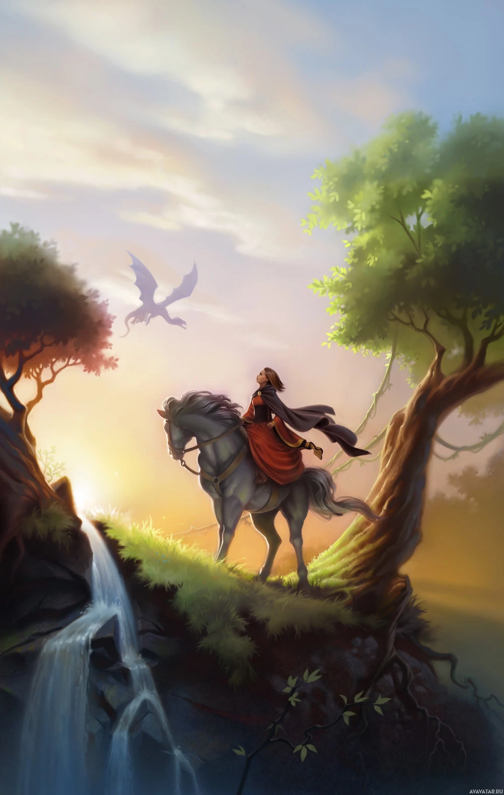 a fantasy setting. The rider is facing away from us, looking out into the distance, possibly towards a castle or fortress on a hill. There are trees and foliage around the rider, suggesting