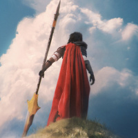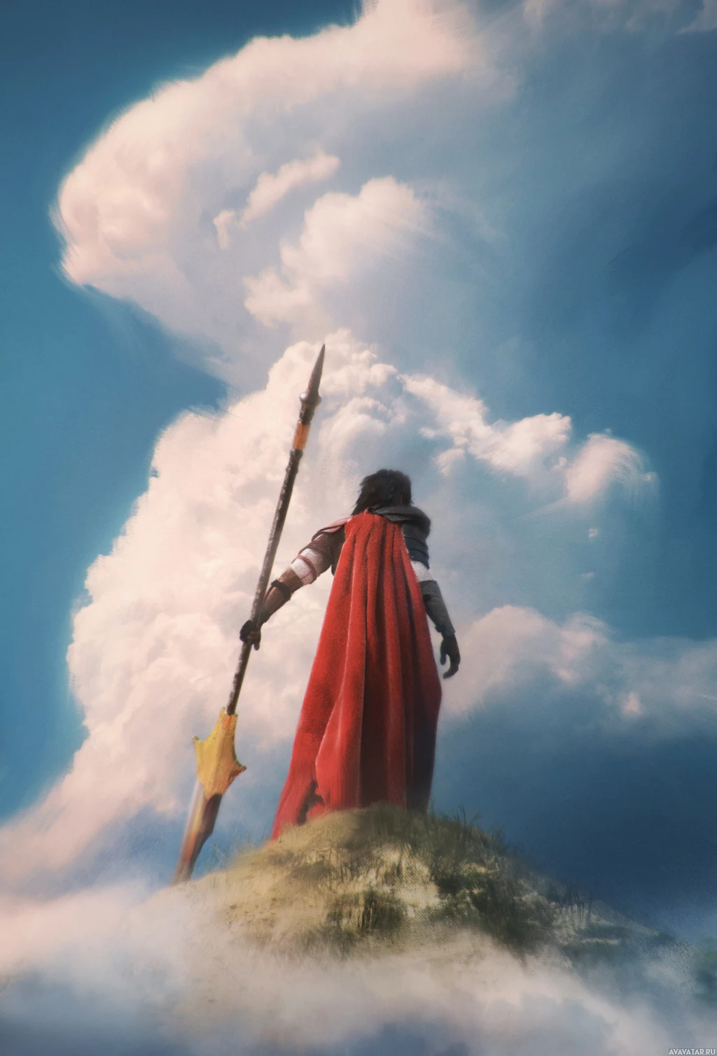 a red cape and holding a spear, suggesting they might represent a warrior or a symbolic character often found in legends or mythology. They are facing away from the viewer, looking towards a horizon or destination that's not visible in the image. The background consists of a sky with fluffy clouds and a hint of landscape at the base, adding to the otherworldly