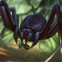 forest setting, with green foliage and misty background suggesting a tropical environment. The spider has
