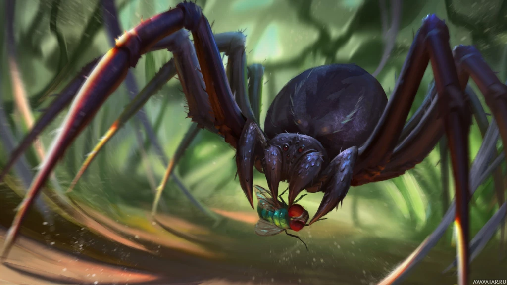 a large spider with prominent red and black markings on its body. It is situated in what appears to be a jungle or