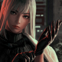 white hair and is wearing what appears to be a black outfit with some sort of emblem on it, possibly indicating her affiliation within the game's universe. Behind her, there are two skeletal figures, one on each side, which adds to the eerie or fantastical atmosphere typical of