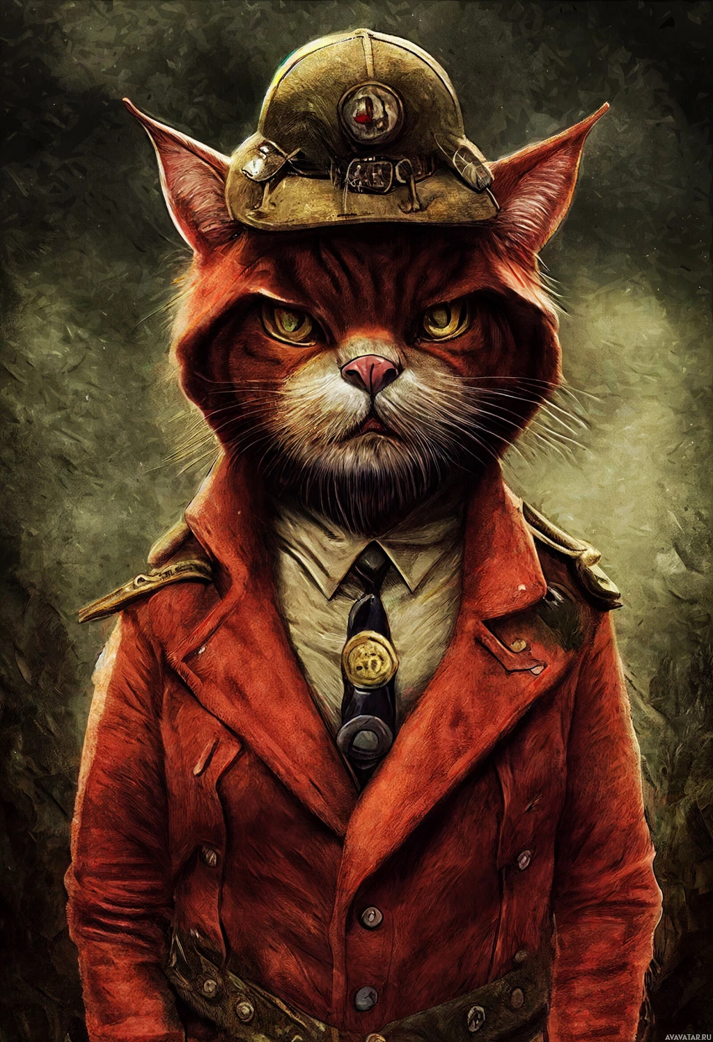trench coat with a tie. The cat is also sporting a hat that seems to be part of an outfit designed to resemble a uniform or costume typically associated with adventurers or explorers. This anthropomorphic portrayal gives the impression of
