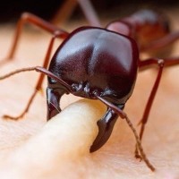 The image shows an ant on a person's skin. The ant appears to be tasting or exploring the surface of the skin with its antennae, which is
