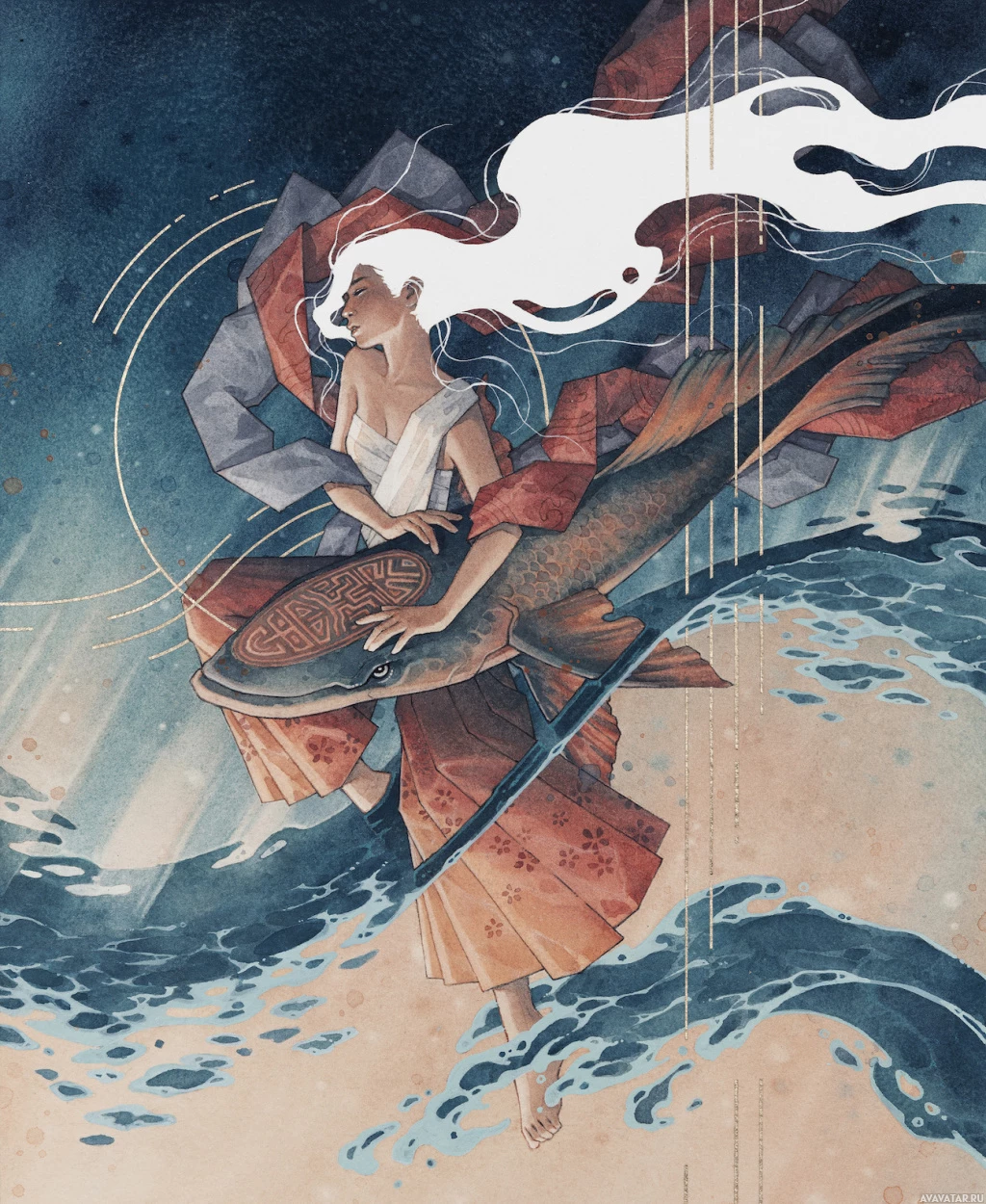 white hair, and dressed in what appears to be traditional Japanese attire. She is holding an instrument that looks like a flute or recorder. A fish, possibly a koi or similar species, is swimming near her, seemingly playing the instrument as if it were being blown into by