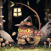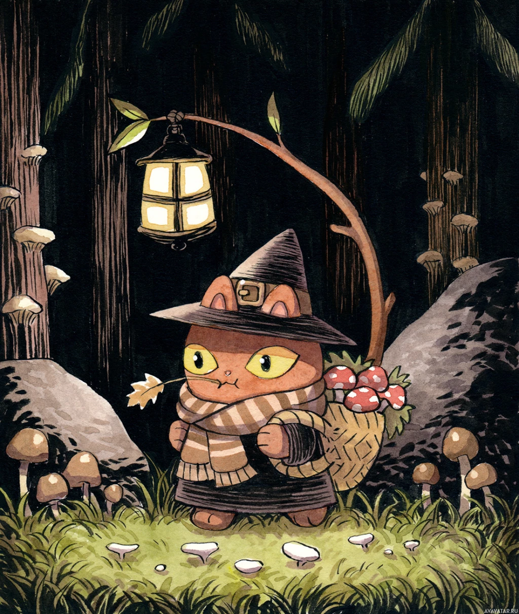 a witch hat and holding what appears to be a lantern in one paw, while the other paw holds a basket with mushrooms growing out of it. The cat also has a scarf wrapped around its neck. In the background, there's an impression of a forest with tall trees and