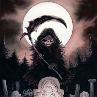 the central character, who appears to be the focus of this scene. The overall atmosphere suggests themes of mortality, mystery, or perhaps an encounter between life and death.