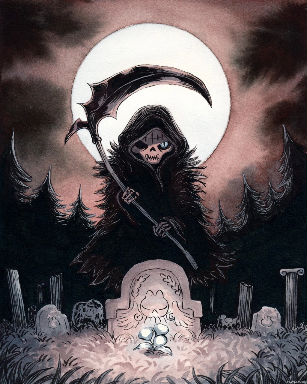 a full moon, with a silhouette of trees and possibly gravestones in the background. A small figure is depicted kneeling before