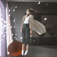 the natural light is diffused. There are some papers floating in the air near the window, adding a whimsical or dreamy quality to the scene.
