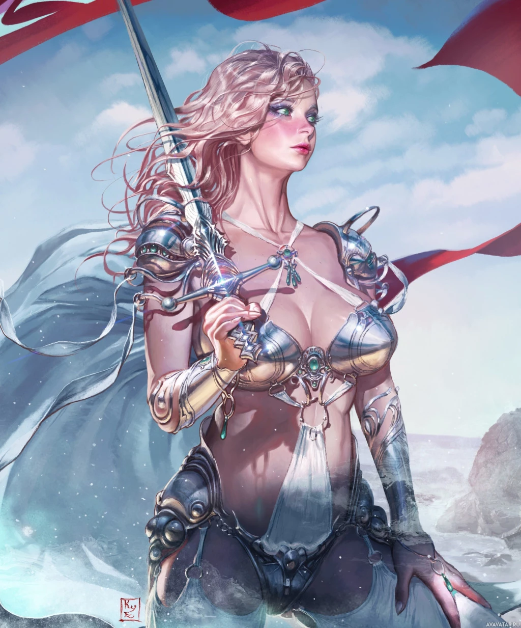a female character depicted in an artistic style that combines elements of fantasy and high-fantasy genres. She is shown holding a sword with her right hand, suggesting she may be a warrior or a fighter. Her long