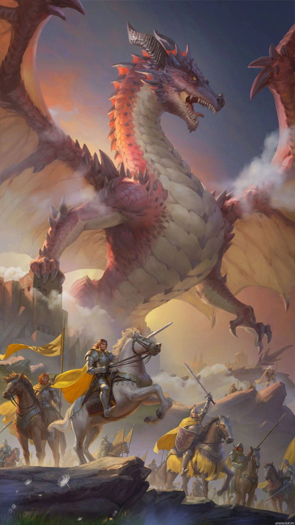 a fantasy scene with a dragon at the center. There are several human figures on horseback, and some of them are holding banners or flags, which suggests they may be knights or soldiers from a bygone era or