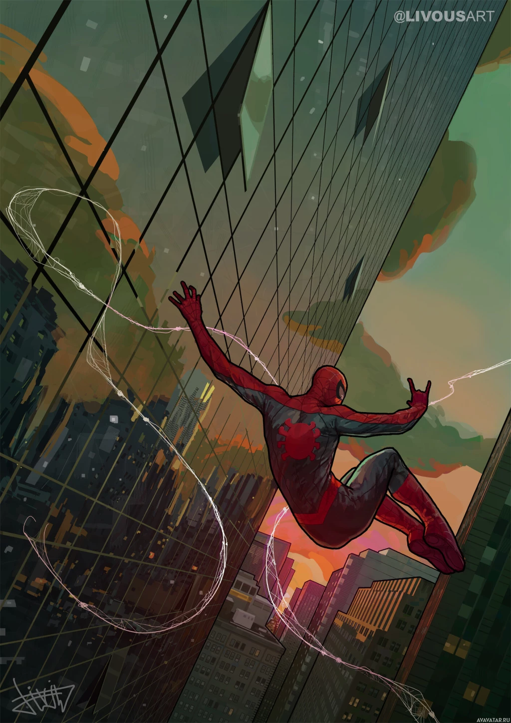 The image depicts a stylized illustration of Spider-Man from behind as he swings through the air. He is wearing his iconic red and blue suit with web patterns, and there are