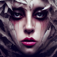 an abstract pattern made up of feathers or similar textures that create a sort of mask-like effect around her head. The artwork has an intricate and possibly symbolic design with attention to detail, particularly in the feather or leaf-like elements that make up