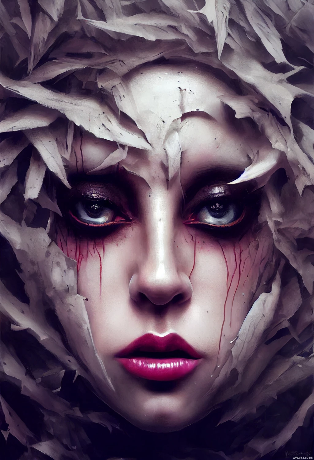 red marks or designs on her cheeks, which could be interpreted as blood or another kind of decorative marking. Surrounding the central figure is