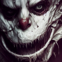 The image shows a character with exaggerated features that appear unsettling, often associated with horror or dark fantasy themes. The character is wearing makeup and has an expression that could be interpreted as menacing or evil. It's important to note that this description is based on the content of the image and the context provided.