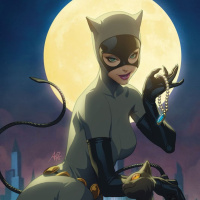 The image shows an illustrated scene featuring the character Catwoman, who is a fictional superheroine appearing in American