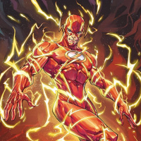 electrical energy that powers him and often causes a trail of lightning behind him when he moves at supersonic speeds. The background suggests an intense or dramatic setting, fitting the heroic persona of this