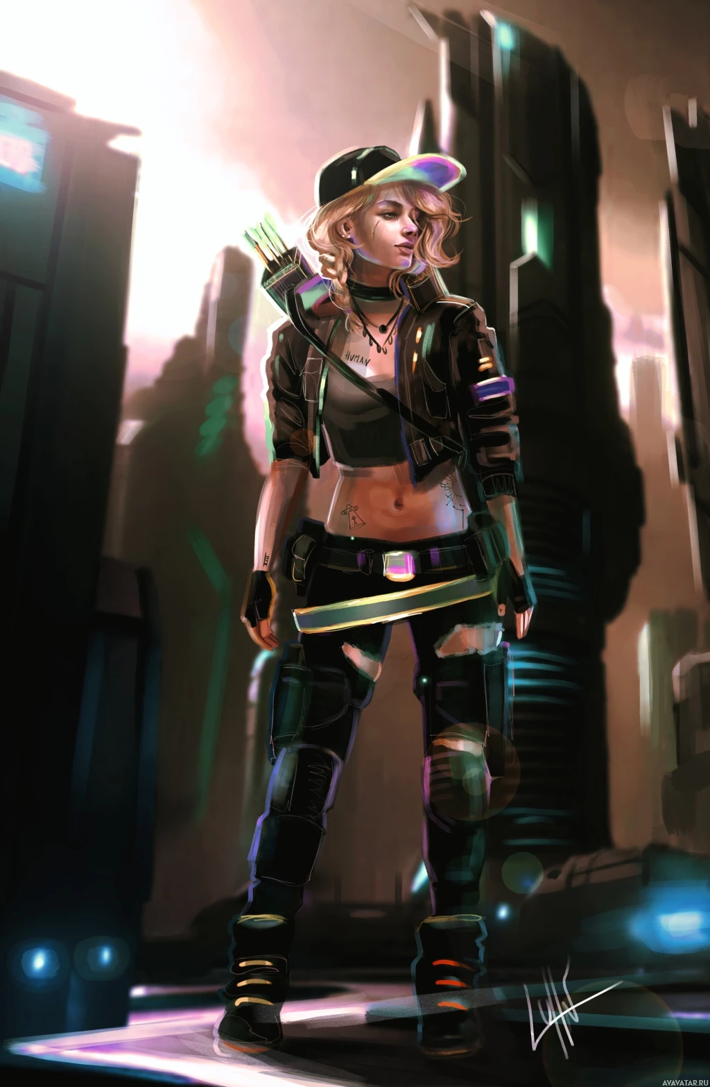 a utility belt with various items attached to it. In her hand, she holds a weapon that appears to be a crossbow or bow. The background suggests
