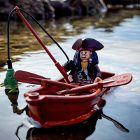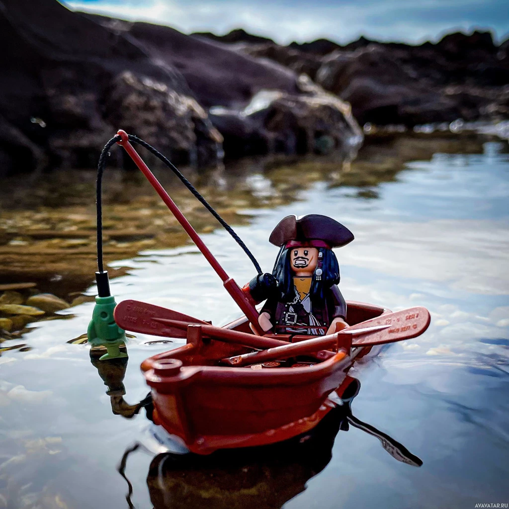 a Lego figure that resembles Captain Jack Sparrow from the Pirates of the Caribbean movies. The figure is placed in a small boat made out of