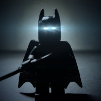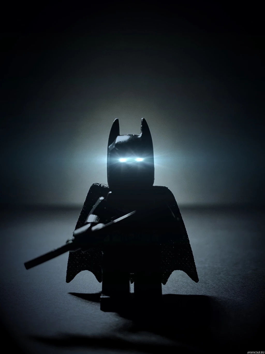 utility belt and the other holding what appears to be a weapon, possibly a gun or a batarang. The lighting highlights the figure's details, giving it a dramatic and focused appearance.