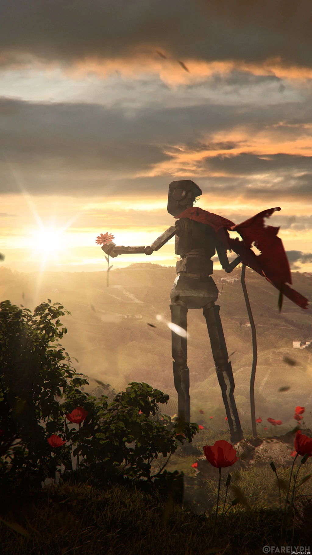 The image shows a robot standing in the foreground with its back turned to the viewer. In the background, there's a sunset or sunrise illuminating a landscape that appears serene and somewhat post-apocalyptic due to the presence of