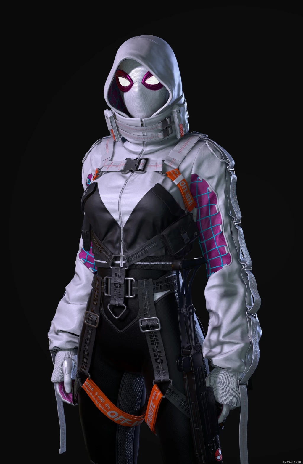 Gwen Stacy, who is one of the playable characters in the game. She is depicted with her distinctive purple and