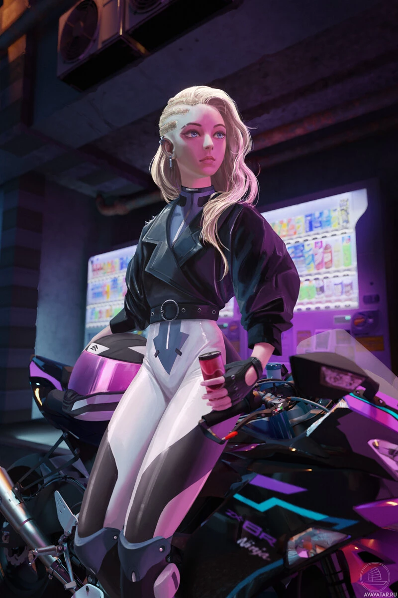 blonde hair and is seated on what appears to be a motorcycle. She is wearing