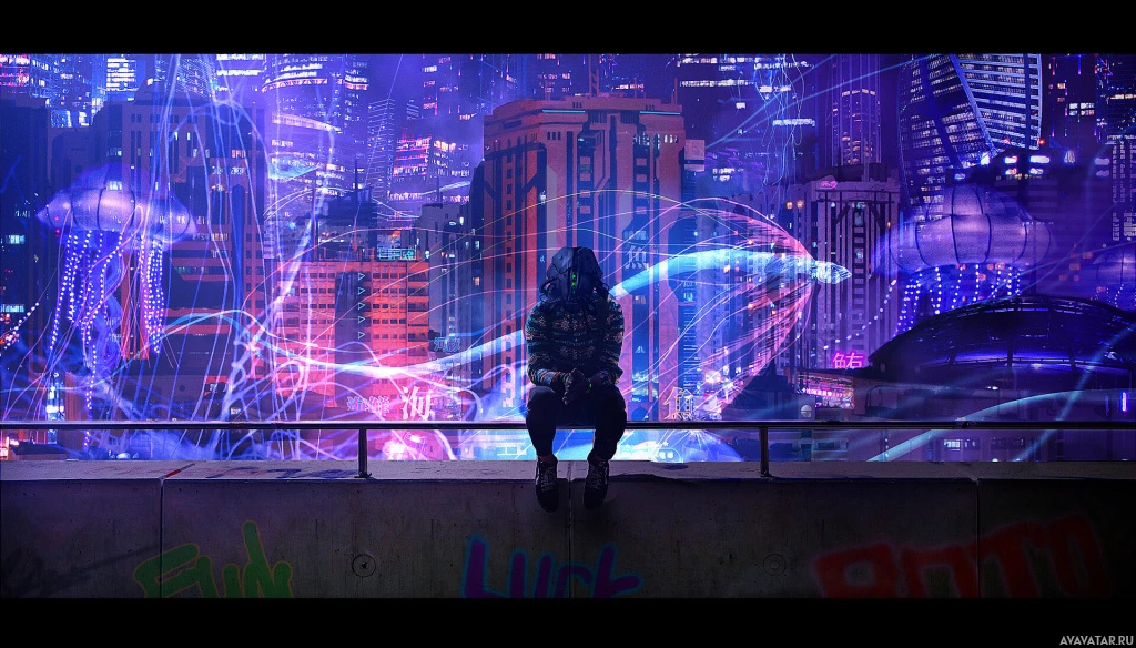 neon lights illuminating the scene. In the foreground, there is a silhouette of what appears to be a person sitting on a bench or platform overlooking the city. The setting gives off a vibe that could be associated with cyberpunk or science