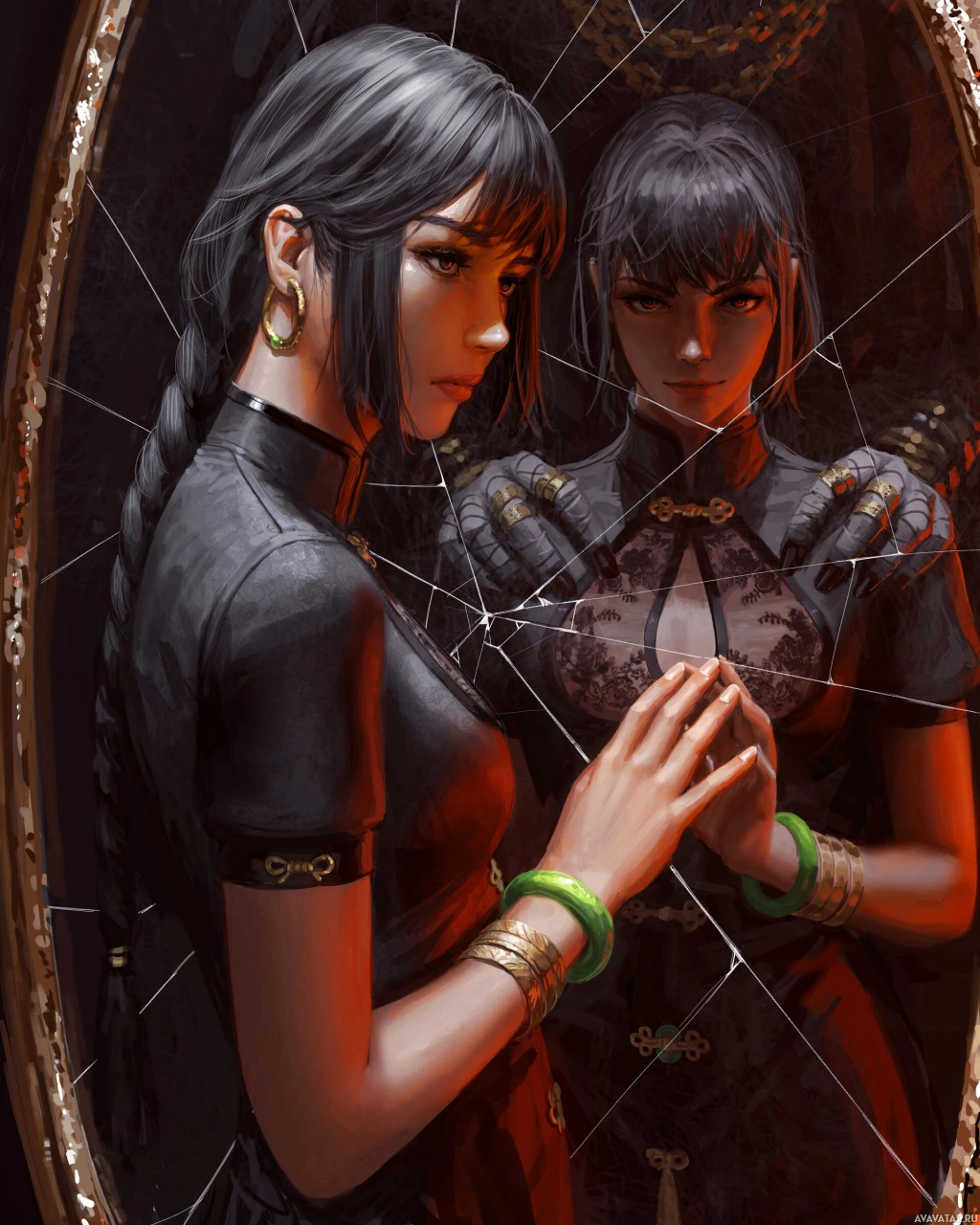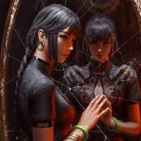 dark hair, looking at her reflection in a mirror. She is wearing what appears to be traditional Asian attire, suggesting she might be a character from an Asian-inspired story or game. Her expression seems contemplative or sad. There are also elements that resemble cracked glass around the edges of the mirror, adding