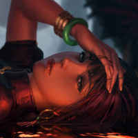 a female character, who appears to be lying on her back with one hand resting under her cheek. She has short