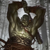 muscular build, green skin, and distinctive features like large ears and tusks. In its hands, it holds