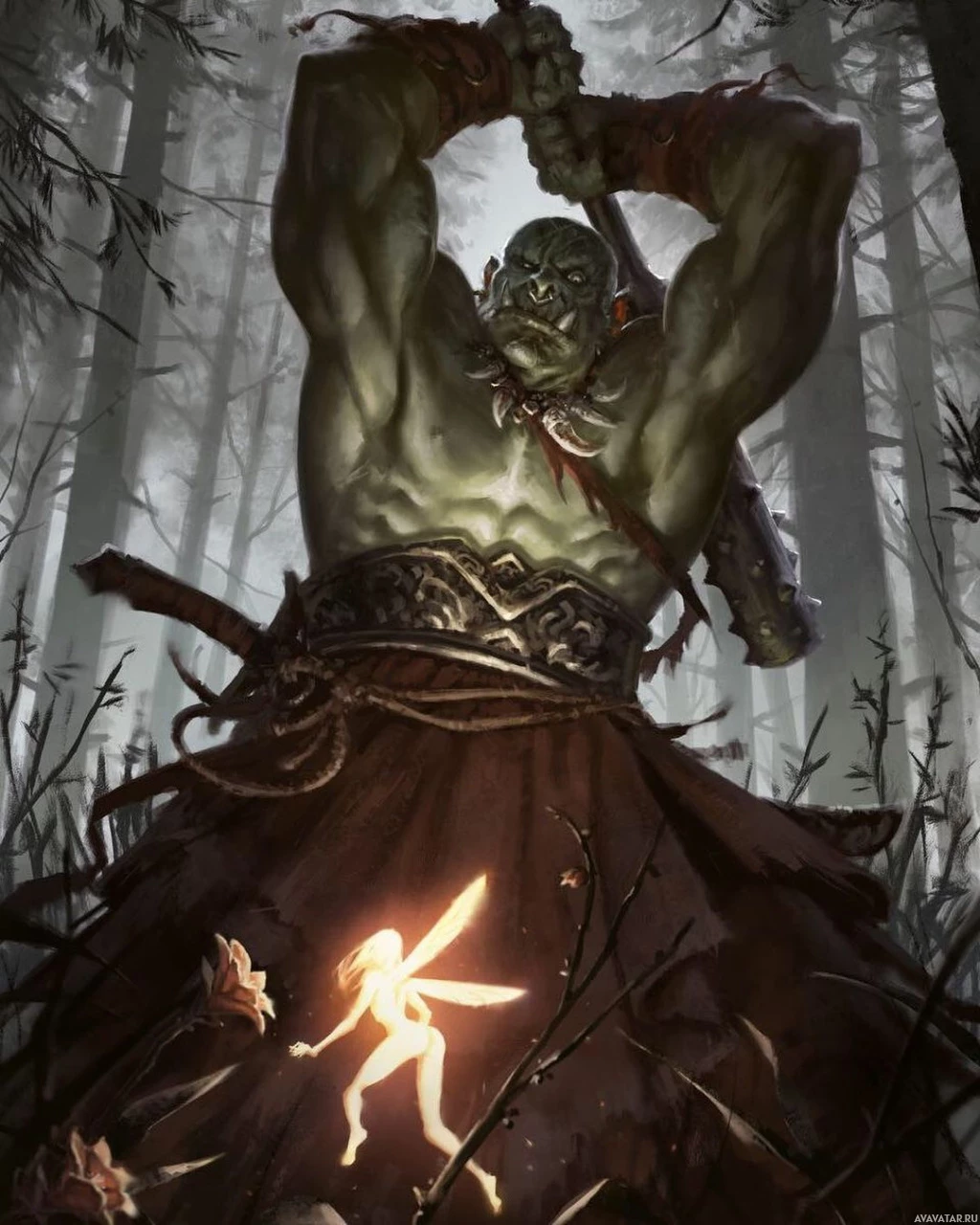 fantasy art featuring an orc, which is a fictional creature commonly found in the universe of various role-playing games and fantasy genres. The orc depicted here appears powerful and fierce, with