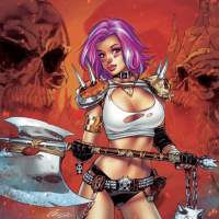 a muscular build and is wearing armor that includes spikes, suggesting a warrior or combatant role. In her hands, she holds an axe, which indicates that she might be a fighter or warrior of some sort. The background suggests a battlefield or