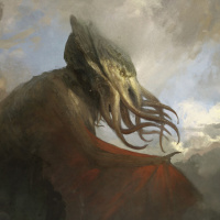 a fantasy scene with a prominent sea monster. The creature appears to be inspired by Cthulhu,