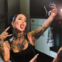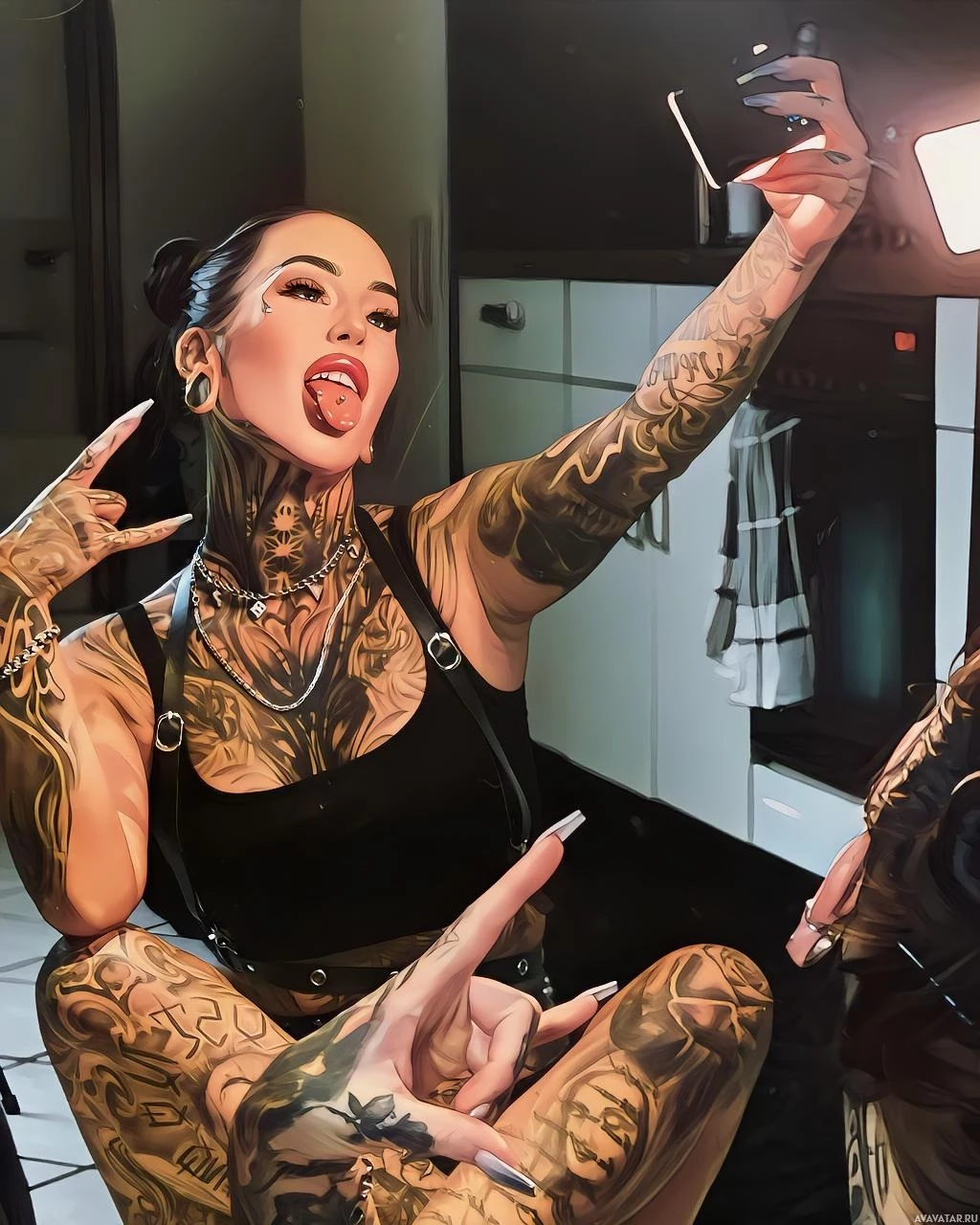 The image shows a person sitting in what appears to be a kitchen. The individual has several visible tattoos and is wearing