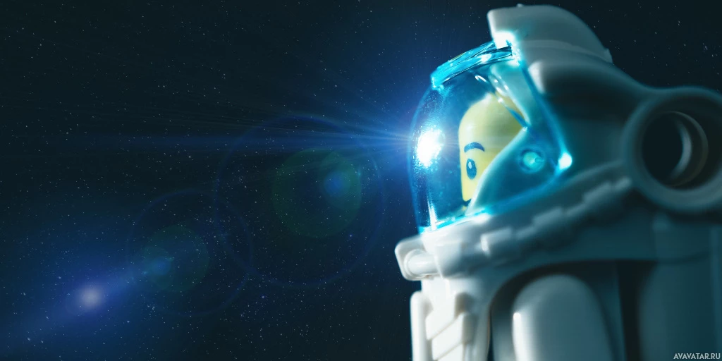 На картинке изображен астронавт из набора Lego. Фигурка изображена в космическом снаряжении, с такими заметными элементами, как шлем с забралом и скафандр. На заднем плане изображена космическая среда со звездами и туманностями.