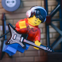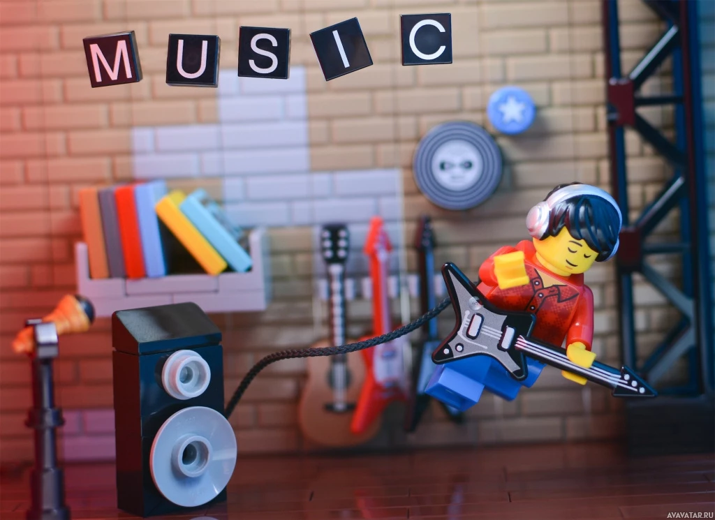 Lego character is holding an electric guitar and seems to be performing on a stage with various music-related items around, such as a soundboard, musical notes, and records. The scene is set up in a way that gives the impression of a small concert or