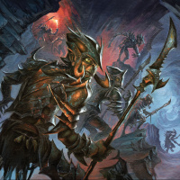 humanoid figure with similar features; this one is holding a large shield adorned with what seems to be a goblin face. On the right side of the image, there are other figures that seem to be part of the same scene, but they are partially obscured and not clearly visible due to the angle and perspective. The background is dark, possibly indicating a dimly lit or