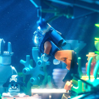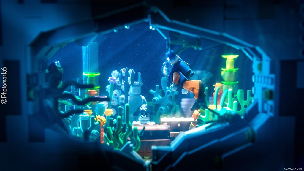 The image depicts a Lego diver underwater, surrounded by various Lego elements that represent