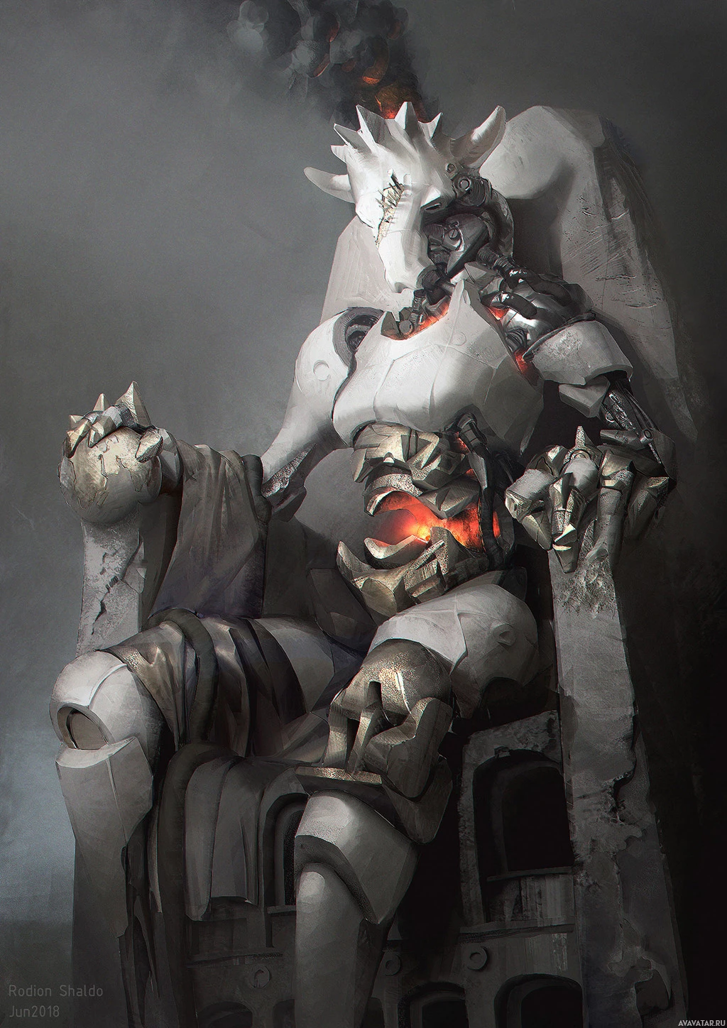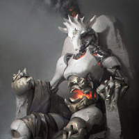 dark tones and hints of destruction. The presence of the throne and the armor give it an almost regal or authoritative appearance, despite