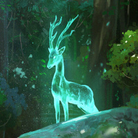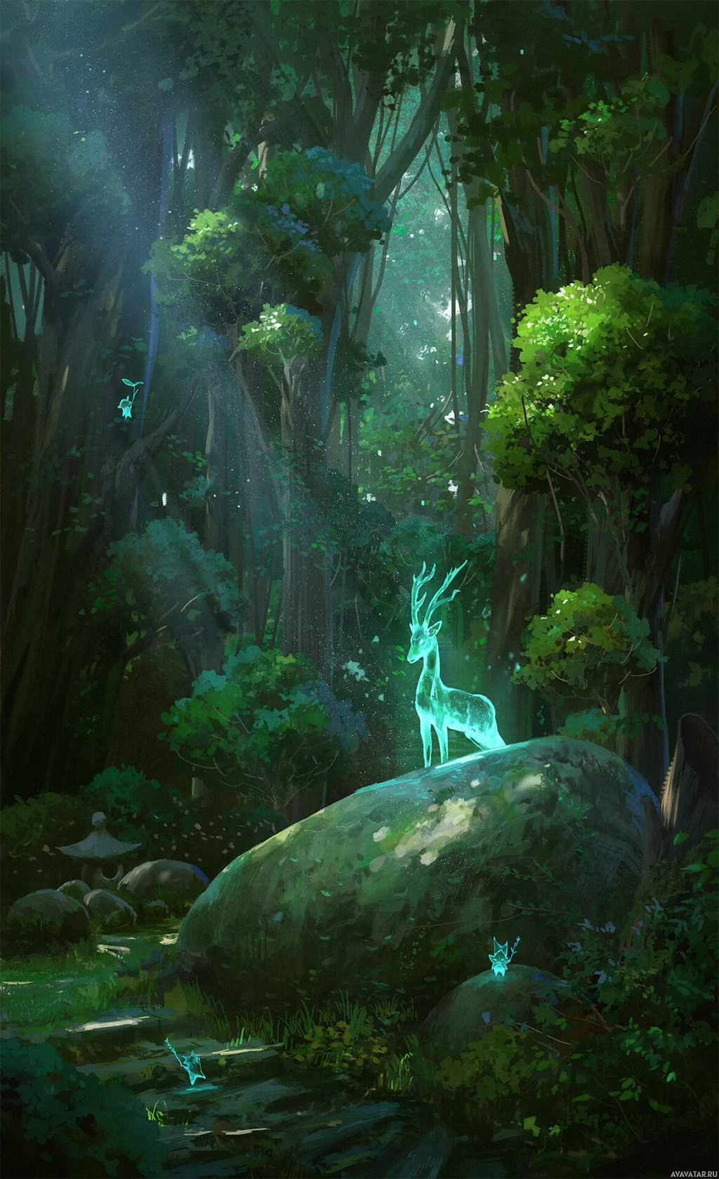 The image features a fantastical scene within a forest. There is a deer-like creature with antlers, sitting on a rock and surrounded by foliage. The setting appears to be a magical or enchanted forest, evidenced by the greenish glow in the background and the misty atmosphere. It's a serene and mystical image that could belong to a fantasy theme or story.