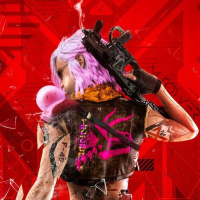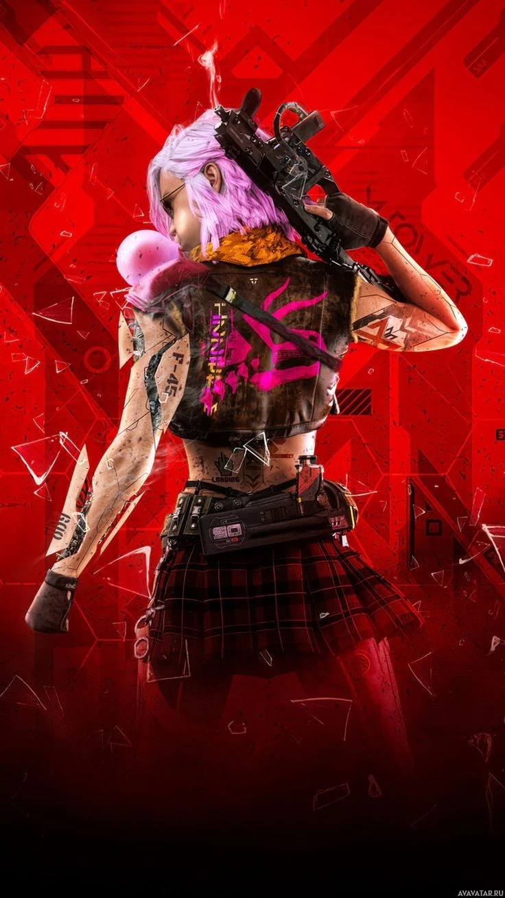 pink hair, which is visible in the foreground, and she's holding what appears to be a weapon with two hands. Her attire includes elements that could suggest a futuristic or combat-oriented style. The background has a red color scheme with digital and industrial designs, contributing to an overall intense and high-energy feel.