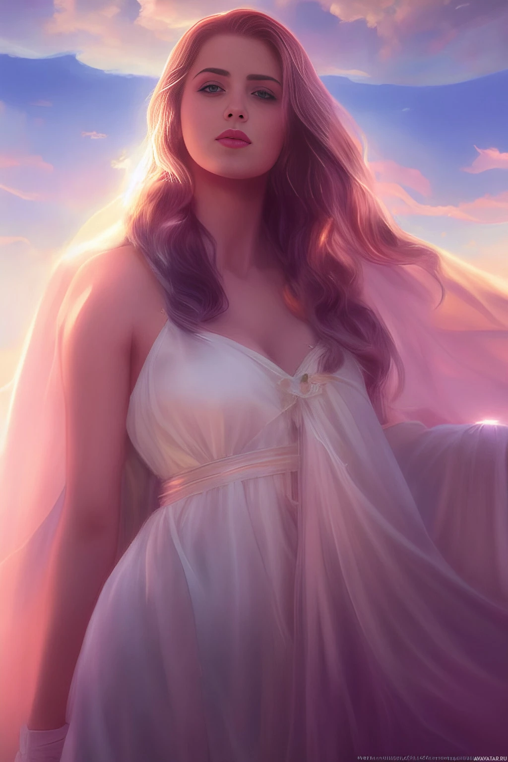 a serene expression on her face as she gazes into the distance. The overall atmosphere of the image suggests it may have been created for