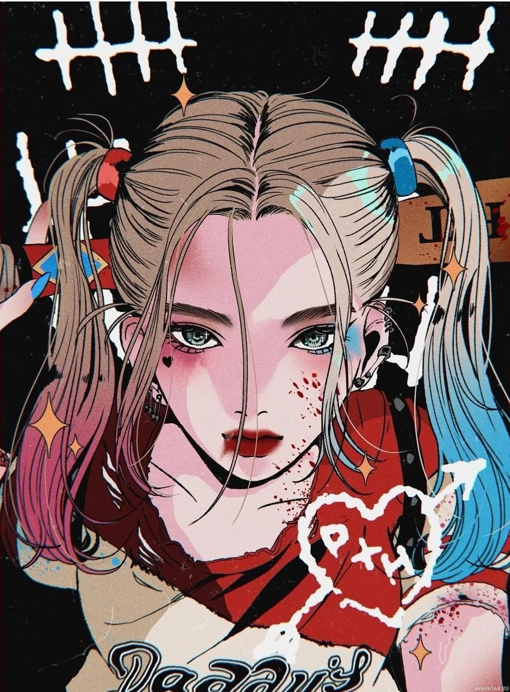 blonde hair styled in pigtails, her face paint or makeup (often featuring red accents), and her signature outfit with the colors red, white, and blue. The illustration showcases her
