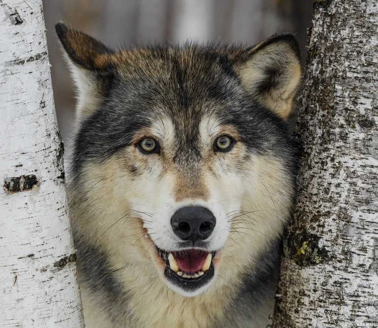 a clear view of its head and facial features, including its eyes, nose, and mouth. The background is a blurred depiction of