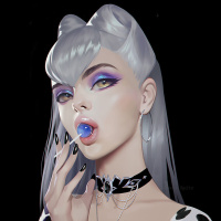 This is an illustration of a character with white hair and cat-like ears. The character is wearing makeup that includes