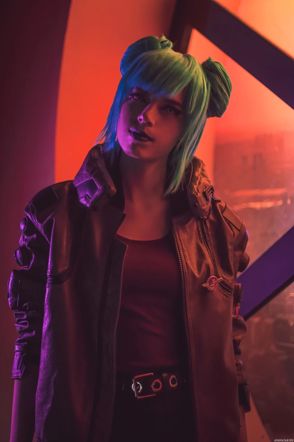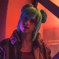 a leather jacket and has distinctive turquoise hair with bangs and a side parting. They are looking directly at the camera, giving