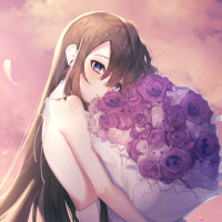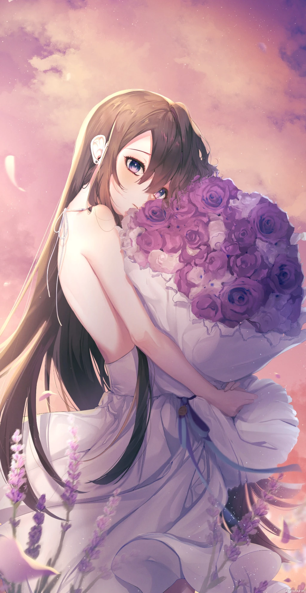 female character holding a bouquet of purple flowers. She appears to be dressed in