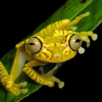 The picture shows a frog with bright yellow skin, which is characteristic of certain species like the poison